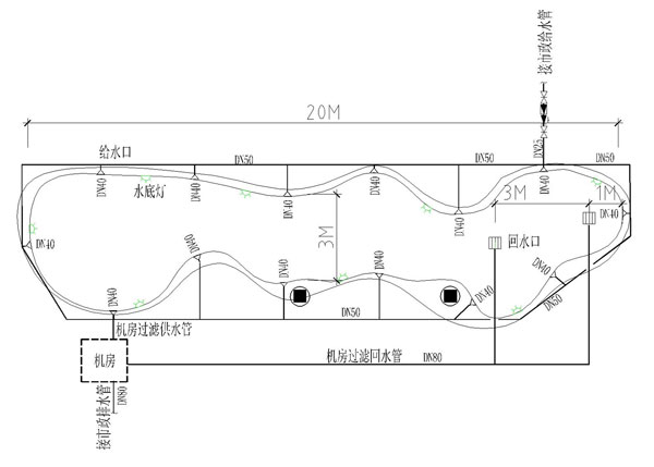 系統二:補水系統。采用由市政管網直接補水,在泳池邊設進水口,按初次注水不超過48小時計,管徑為DN25,與別墅總管相同,水池水量90m³。每日補水量取總水量3%,計2.7m³,在每日清潔吸污后補充,或每3-7日投加混凝劑沉淀吸污后補充。