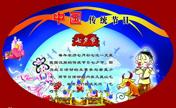 其起源于對自然的崇拜及婦女穿針乞巧,后被賦予了牛郎織女的傳說使其成為象征愛情的節(jié)日。現(xiàn)被認為是“中國情人節(jié)”。