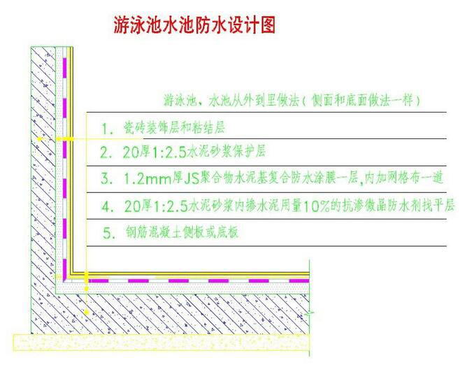 以上就是一個(gè)完整的標(biāo)準(zhǔn)的游泳池防水做好了。由于我們國家無建筑防水專業(yè),所以面對游泳池防水設(shè)計(jì)似乎沒標(biāo)準(zhǔn)可言,很多人設(shè)計(jì)人員也不知道游泳池里面需要做一道剛性微晶防水層的,只知道做防水涂料,此防水方案是我公司用10多年的建筑結(jié)構(gòu)設(shè)計(jì)經(jīng)驗(yàn)結(jié)合對多個(gè)游泳池防水設(shè)計(jì)的跟蹤得出的結(jié)果。游泳池防水必須做剛?cè)峤Y(jié)合兩道設(shè)防,那樣才是保險(xiǎn)的,其實(shí)真正起到防水作用的是游泳池的鋼筋混凝土底板和側(cè)板,微晶防水剛性層,防水涂料其實(shí)是起到輔助防水,但很多設(shè)計(jì)師也不是很清楚。