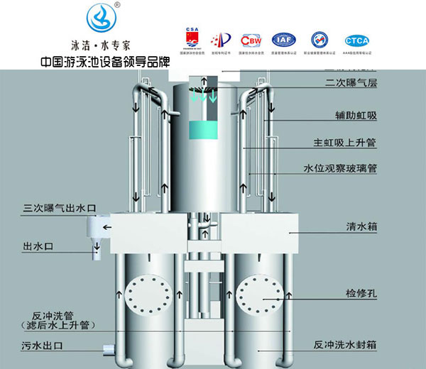 泳池水過濾凈化工藝包括:“降低池水的渾濁度、提高池水的透明度、去除池水中膠狀或顆粒狀有機物、細菌和病毒”。保證游泳者的安全、衛生,對池水進行過濾是不可缺少的。