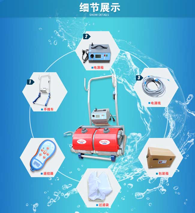 作為合格的水質(zhì)管理員應(yīng)知道泳池水處理中有一項(xiàng)池底清潔處理工作必須用到游泳池吸污機(jī),也叫水下吸污機(jī),水龜?shù),主要針?duì)池水中的皮屑、頭發(fā)、樹葉、塵埃等臟物進(jìn)行清潔,使水清澈透明。