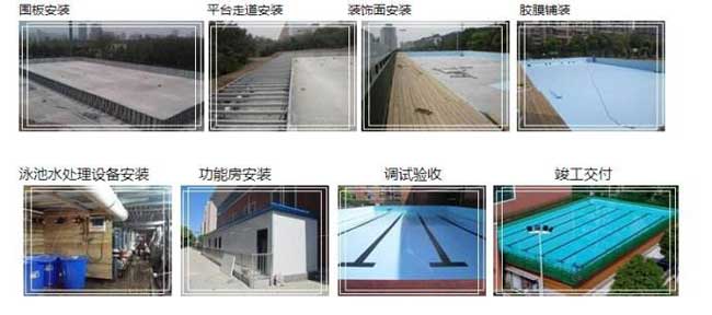 在確定實(shí)施方案后工廠組織生產(chǎn),拼裝式游泳池的各部件均在工廠生產(chǎn)完成,完成生產(chǎn)后一次性運(yùn)至安裝現(xiàn)場(chǎng)進(jìn)行整體組裝。安裝前需要一塊平整、堅(jiān)實(shí)的空曠場(chǎng)地,使用方提供安全的380V高壓電(30-50KW),上下水市政管路。安裝過(guò)程為15-25天(根據(jù)泳池大小而定)。